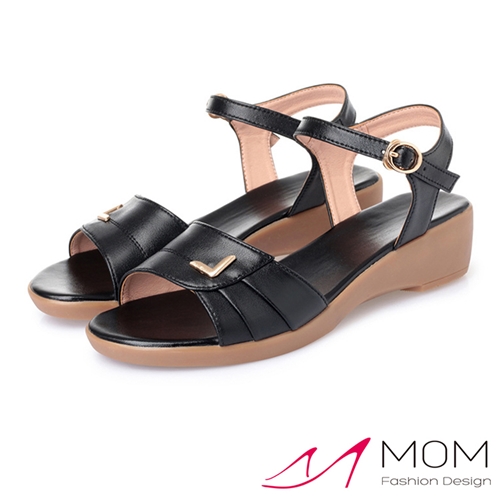 真皮舒適圓頭金屬釦飾優雅坡跟涼鞋 黑 |