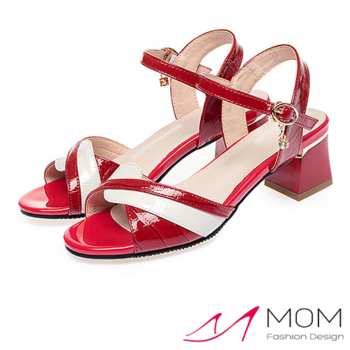 真皮鱷魚皮紋撞色幾何交錯線條粗跟涼鞋 紅 |