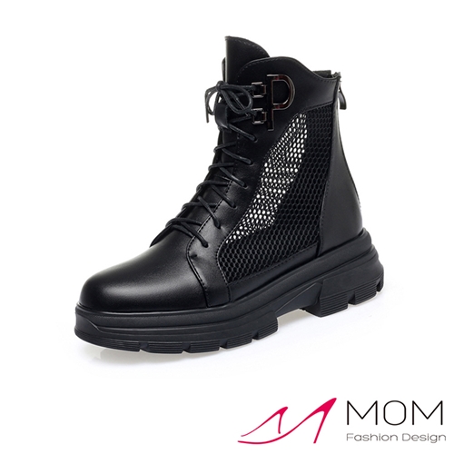 真皮時尚網紗拼接繫帶個性馬丁靴 黑 |