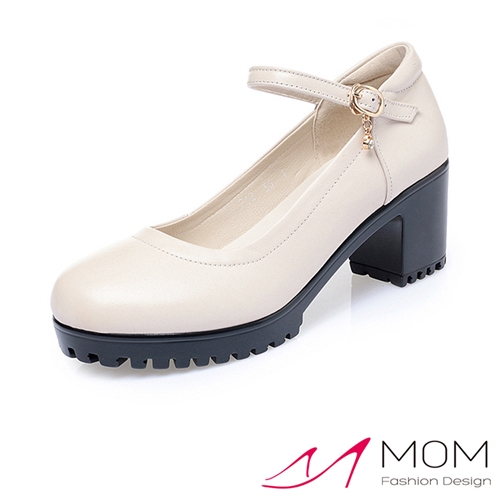 真皮淺口防水台一字繫帶粗跟鞋 I款 米色6.5CM高 |