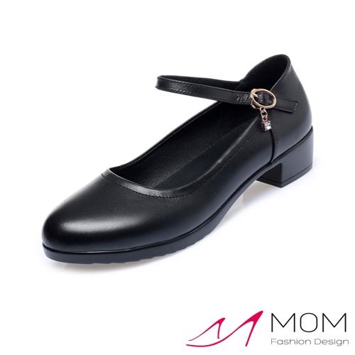 真皮小圓頭淺口防水台美鑽一字釦帶跟鞋 A款 黑色3CM高 |