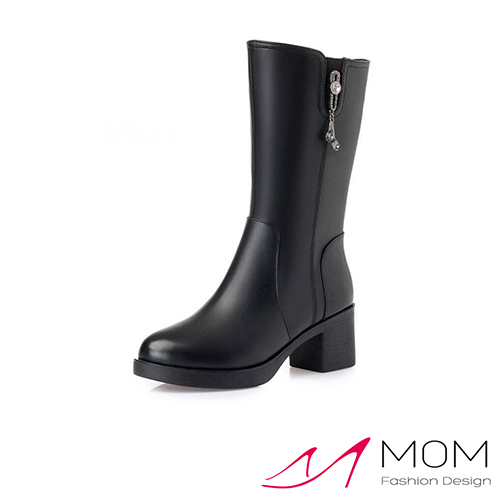 真皮氣質美鑽流蘇金屬釦飾粗跟中筒靴 黑 |