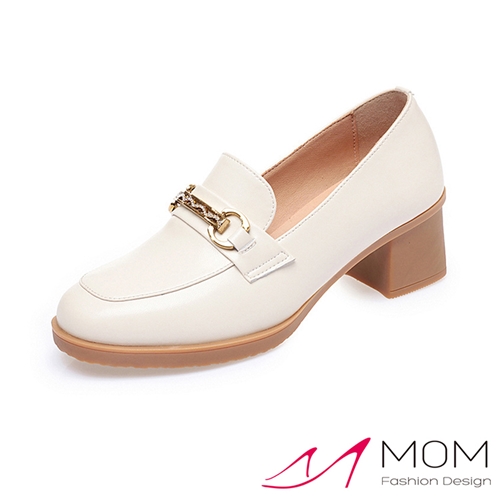 真皮一字美鑽釦飾粗跟樂福鞋 白 |