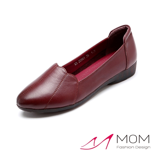 真皮花型鞋口車線軟底舒適低跟鞋 酒紅 |