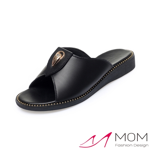 真皮軟底復古金屬釦飾坡跟平底拖鞋 黑 |