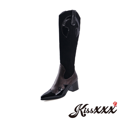 [快速出貨] 西部牛仔風個性拼接尖頭撞色粗跟長靴 黑 *KISSXXX* |
