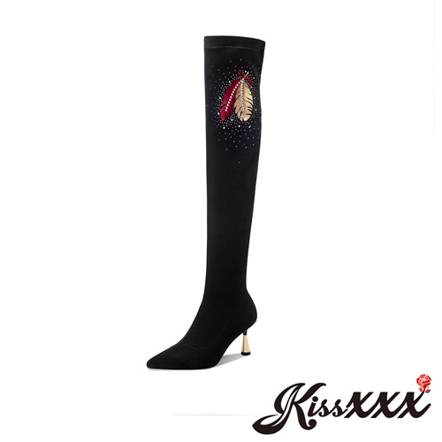 [快速出貨] 典雅羽毛刺繡燙鑽絨面尖頭高跟過膝長靴 黑*KISSXXX* |