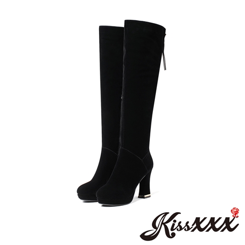 [快速出貨] 美腿效果小圓頭金邊後拉鍊流蘇飾及膝長靴 黑*KISSXXX* |