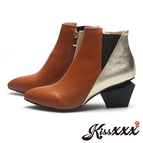 [快速出貨] 真皮小尖頭拼接時尚幾何異形跟切爾西短靴 棕*KISSXXX* |
