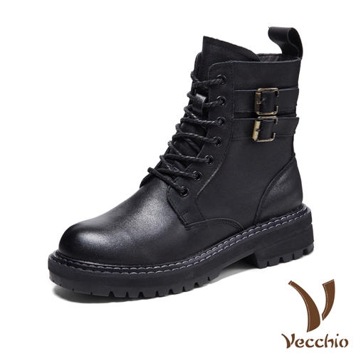 [快速出貨] 真皮頭層牛皮雙皮帶釦繫帶時尚馬丁靴 黑*Vecchio* |
