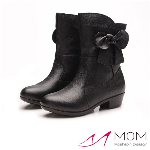 [快速出貨] 真皮頭層牛皮優雅立體蝴蝶結粗跟中筒靴 黑*MOM* |