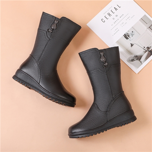 [快速出貨] 真皮頭層牛皮美鑽貓咪釦飾舒適坡跟中筒靴 黑*MOM* |