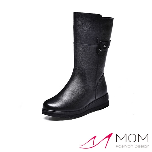 [快速出貨] 真皮頭層牛皮極簡皮帶釦飾舒適坡跟中筒靴 黑*MOM* |