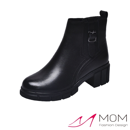 [快速出貨] 真皮頭層牛皮皮帶釦粗跟復古切爾西短靴 黑*MOM* |