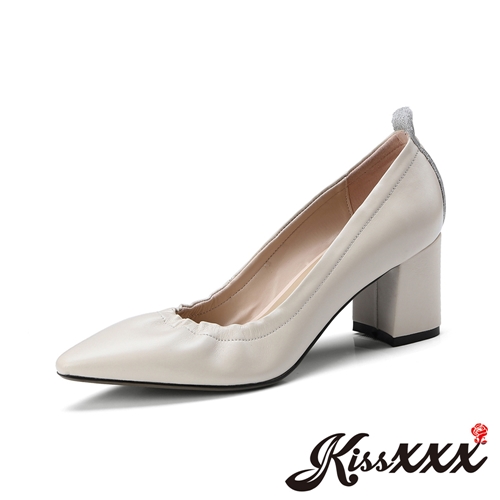 [快速出貨] 真皮優雅抓褶小尖頭淺口高跟鞋 米*KISSXXX* |