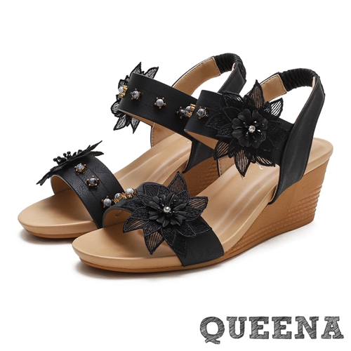 [快速出貨] 立體紗花珍珠釦飾一字帶坡跟羅馬涼鞋 黑*QUEENA* |