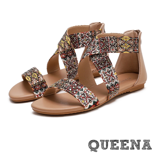 [快速出貨] 圖騰印花燙鑽一字交叉帶低跟涼鞋 杏*QUEENA* |