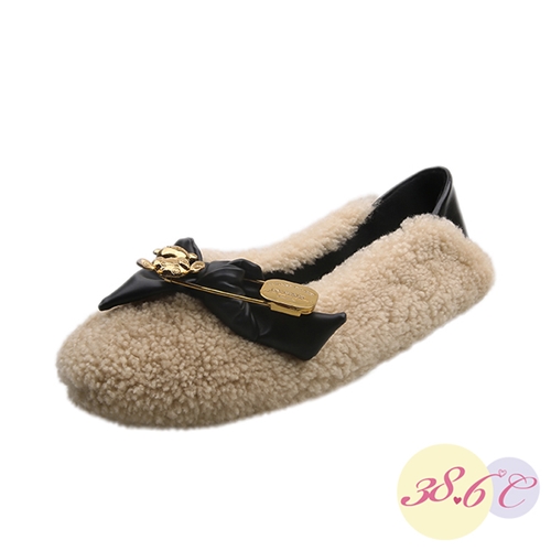 [快速出貨] 可愛捲捲毛絨蝴蝶結小熊別針便鞋 米*38.6°C* |