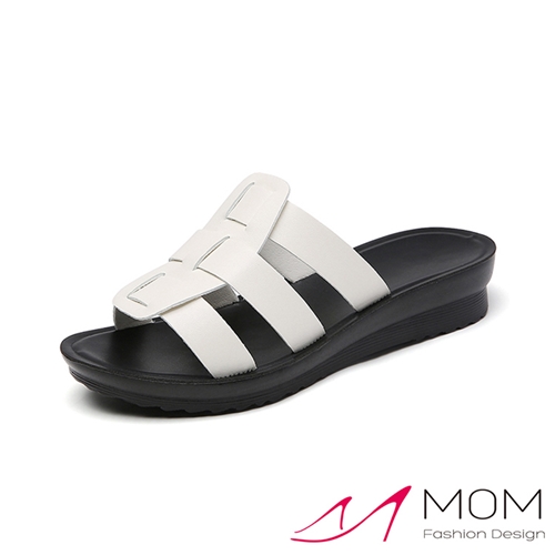 真皮復古縷空設計坡跟平底拖鞋 米*MOM* |