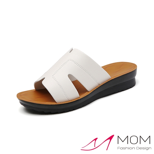 真皮時尚X車線造型坡跟厚底拖鞋 米*MOM* |