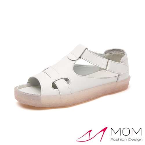 真皮軟底復古百搭設計魔鬼粘平底涼鞋 米*MOM* |