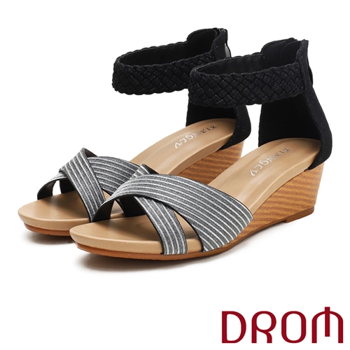 歐美時尚交叉編織繞踝造型坡跟涼鞋 黑*DROM* |