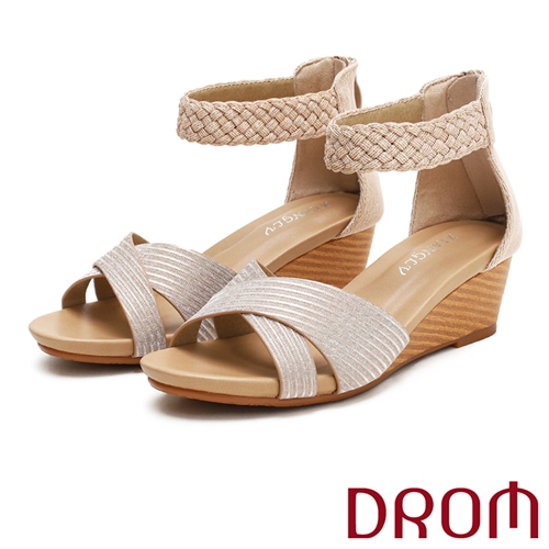 歐美時尚交叉編織繞踝造型坡跟涼鞋 香檳*DROM* |