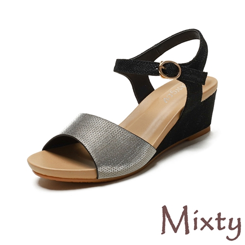 歐美復古金屬亮皮拼接魚口露趾坡跟涼鞋 黑*MIXTY* |