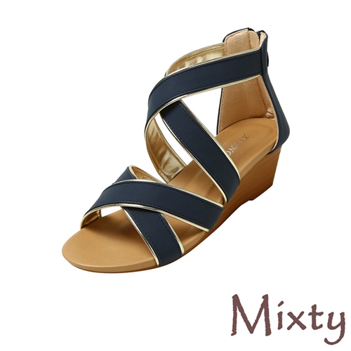 復古優雅金屬亮皮滾邊交叉帶造型坡跟涼鞋 藍*MIXTY* |