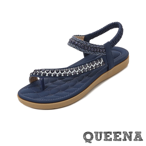 波西米亞民族風閃耀寶石編織Z字夾腳平底涼鞋 藍*QUEENA* |