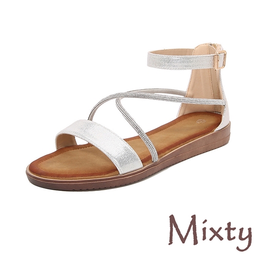 極簡金屬亮皮一字交叉鑽條造型平底涼鞋 銀*MIXTY* |