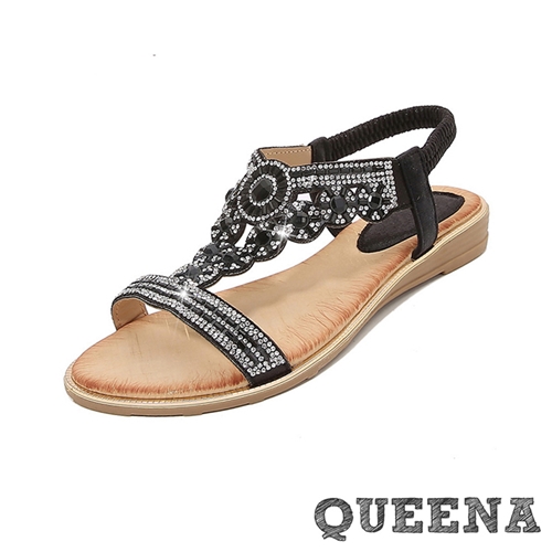 波西米亞民族風閃耀華麗美鑽鋯石工字平底涼鞋 黑*QUEENA* |