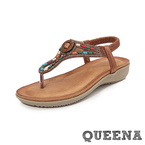 波西米亞民族風木釦彩色串珠造型夾腳坡跟涼鞋 棕*QUEENA* |