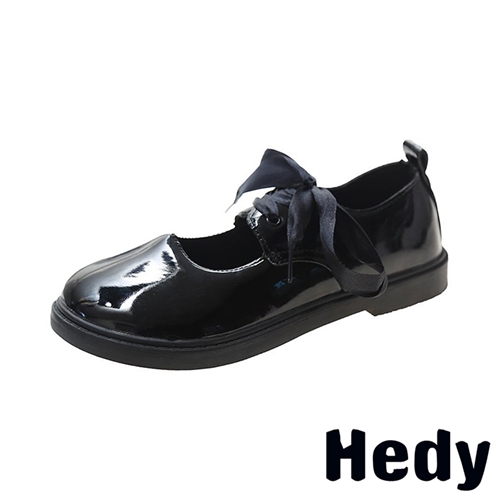 甜美學院風小圓頭綁帶造型休閒娃娃鞋 漆皮黑*HEDY* |