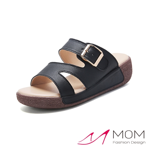 真皮百搭Z字皮帶釦造型厚底拖鞋 黑*MOM* |