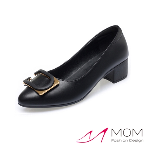 真皮牛皮幾何金屬C釦造型尖頭粗跟鞋 黑*MOM* |