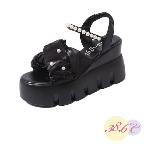 甜美紗花珍珠造型坡跟厚底涼鞋 黑*38.6度C* |