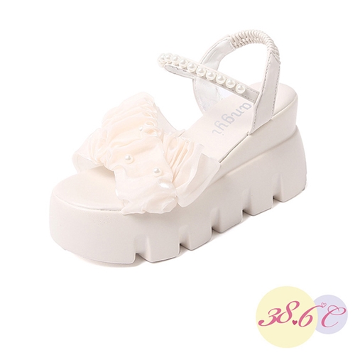甜美紗花珍珠造型坡跟厚底涼鞋 米*38.6度C* |