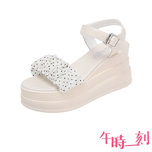 復古撞色點點抓褶一字帶坡跟厚底涼鞋 米*午時一刻* |