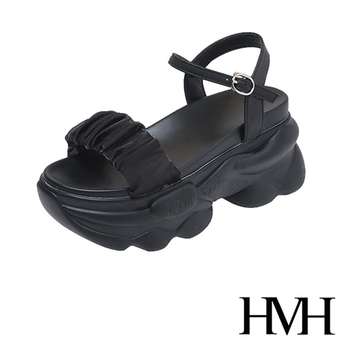網紗抓摺一字造型厚底涼鞋 黑*HMH* |