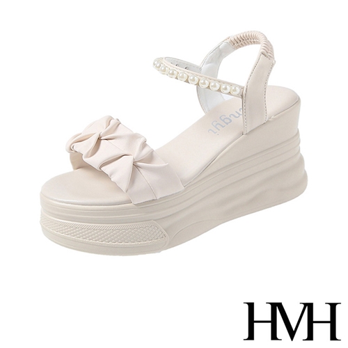 甜美褶皺一字帶珍珠綴飾造型厚底涼鞋 米*HMH* |