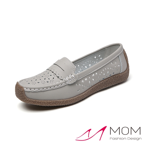 真皮縷空刻花舒適休閒軟底蝸牛鞋 樂福鞋 灰*MOM* |