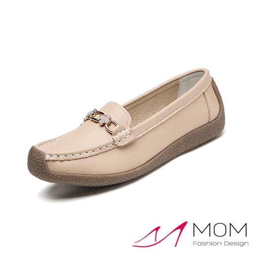 真皮閃耀美鑽馬銜扣飾軟底蝸牛鞋 杏*MOM* |