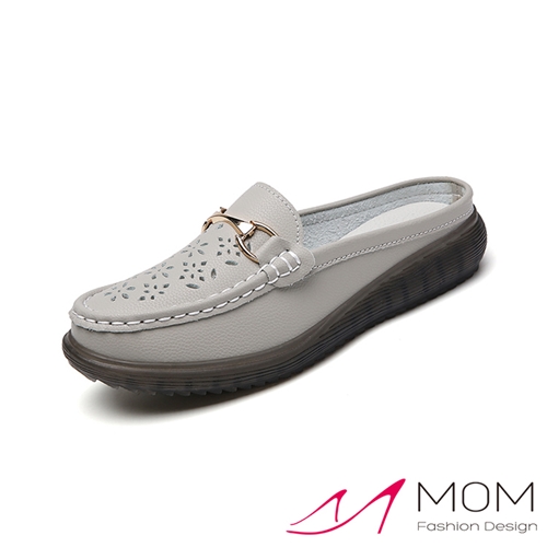 真皮縷空刻花馬銜扣飾包頭坡跟拖鞋 灰*MOM* |