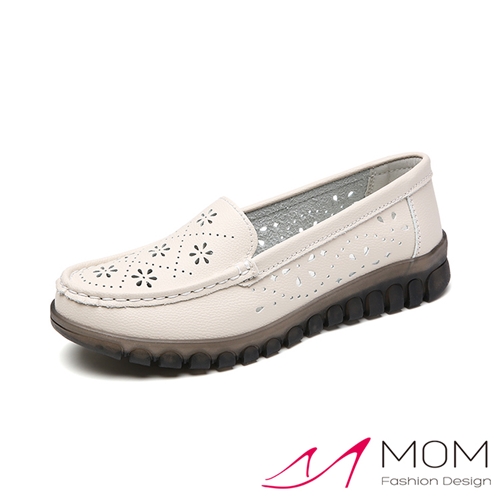真皮透氣縷空小花菱格設計軟底休閒鞋 樂福鞋 米*MOM* |