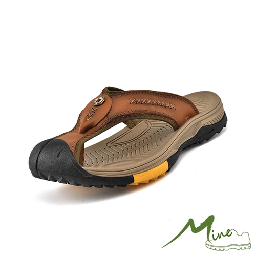 真皮頭層牛皮質感縫線戶外休閒人字拖鞋 棕*MINE* |