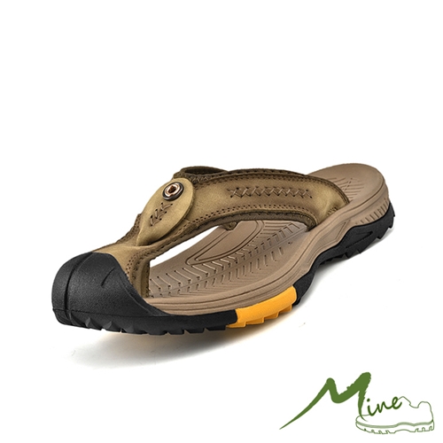 真皮頭層牛皮質感縫線戶外休閒人字拖鞋 卡其*MINE* |