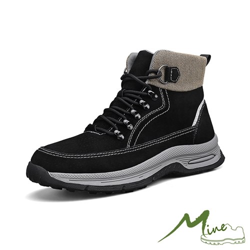 真皮磨砂豚皮設計感繫帶休閒高筒戶外登山鞋 黑*MINE* |