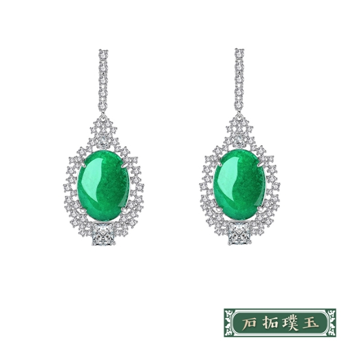 華麗美鑽鑲嵌橢圓綠玉隨寶石造型耳環*石拓璞玉* |