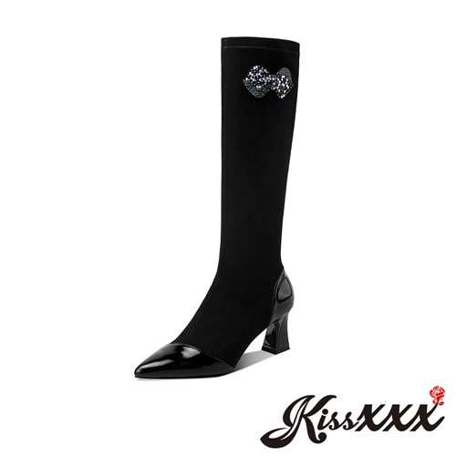 [快速出貨] 真皮細緻蝴蝶結燙鑽造型尖頭典雅長靴 黑*KISSXXX* |
